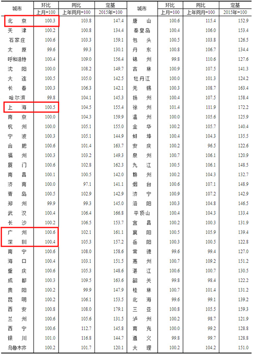 人民網(wǎng)北京10月20日電(記者孫紅麗)10月20日,國家統(tǒng)計(jì)局發(fā)布9月份商品住宅銷售價(jià)格變動(dòng)情況統(tǒng)計(jì)數(shù)據(jù)。經(jīng)初步測算,4個(gè)一線城市新建商品住宅銷售價(jià)格環(huán)比上漲0.4%,漲幅比上月回落0.2個(gè)百分點(diǎn)。其中,北京、上海、廣州和深圳分別上漲0.3%、0.5%、0.6%和0.4%。