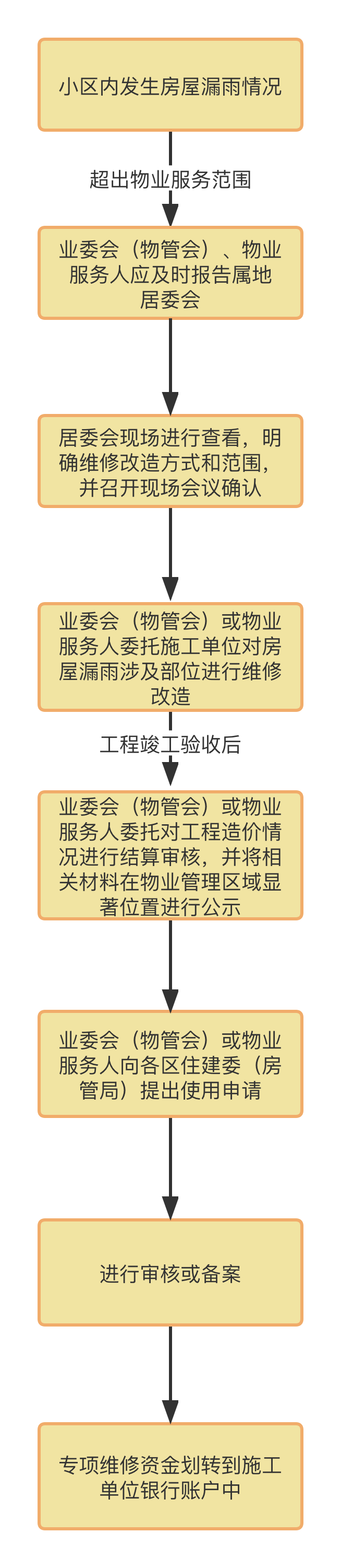 由屬地居(村)民委員會召集業(yè)委會(物管會)、物業(yè)服務人及相關業(yè)主等共同到現(xiàn)場對漏雨情況進行實地查看,明確維修改造方式和范圍,并召開現(xiàn)場會議確認。