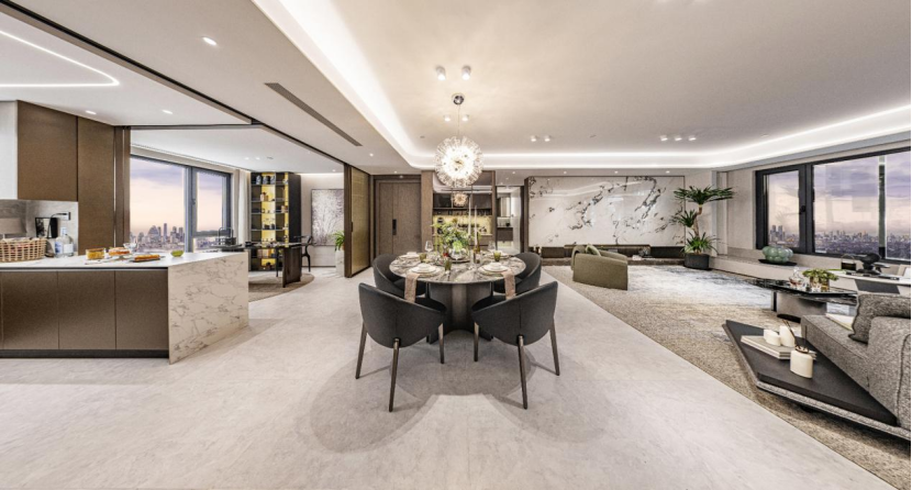 北熙區(qū)170平方米的四室兩廳兩衛(wèi)戶(hù)型則采用了現(xiàn)代簡(jiǎn)約的設(shè)計(jì)風(fēng)格,摒棄繁復(fù)裝飾,使用精選皮革、藝術(shù)玻璃、古銅不銹鋼等現(xiàn)代材質(zhì)匹配大尺度橫向空間,塑造質(zhì)感美學(xué)空間。整體格局規(guī)整,南向面寬達(dá)13.85米,且設(shè)計(jì)了通透、多變的客廳空間,既能與廚房聯(lián)通,也可與書(shū)房互動(dòng),可以是朋友們的歡聚場(chǎng),也可以是靜享品茗、閱讀美好時(shí)光的生活場(chǎng)。主臥套房酒店式設(shè)計(jì),獨(dú)立衣帽間、獨(dú)立衛(wèi)浴,彰顯居者的居住尺度。