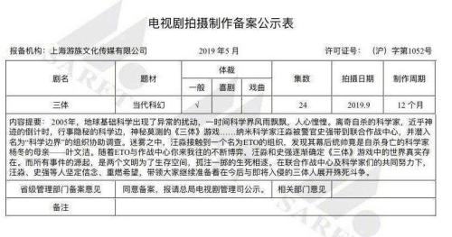 到了今年,國(guó)家廣播電影電視總局5月電視劇備案公示顯示,《三體》將被改編為電視劇,并已通過(guò)備案。電視劇將于9月開(kāi)拍,共24集。