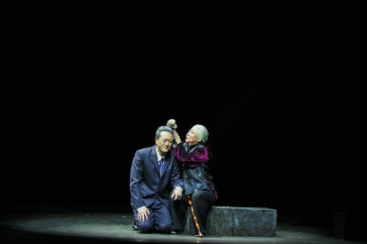 這一幕開場時,先是潮汕英歌舞——潮汕民間流傳的懲惡揚善、吉祥平安的舞蹈。接著,一頭白發(fā)的黃旭華偕妻登場。臺口,另一位拄著拐杖、顫顫巍巍的老太太向他凝望。這就是黃旭華的老母親,她言語不多,不時以拐杖重?fù)舻匕澹磉_澎湃的心情。黃旭華拿出當(dāng)年母親留給他的銀梳子,想跪下來給母親梳頭。誰料,母親激動地說:“我就知道兒子沒有忘記我!”她反而說,要替兒子梳頭。因為她明白:“對祖國的忠,就是對父母最大的孝。”