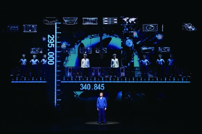 舞美設(shè)計,不僅凸顯主題,也具有形式美——圓環(huán)外框勾勒出潛水艇橫切面的弧度,內(nèi)里的十字鋼鐵結(jié)構(gòu),可以成為甲板欄桿、書房頂梁等等。在展現(xiàn)深潛之際,舞臺周圍的一圈冰屏,則好似儀表盤,時而穩(wěn)定時而模糊……