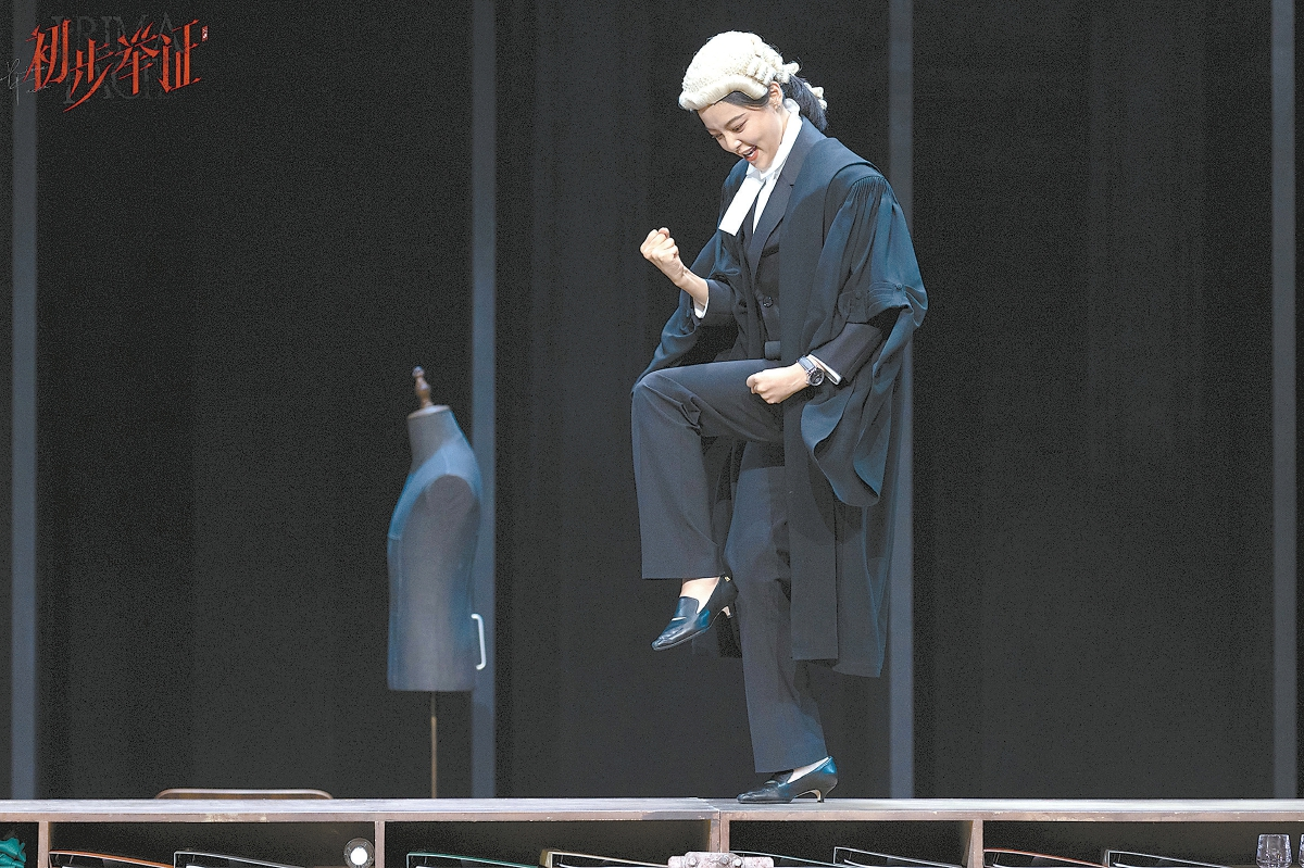 舞臺(tái)極為對(duì)稱。最醒目的,是兩側(cè)微微斜切向后景的賽馬欄。如果從上方俯視,賽馬欄將舞臺(tái)空間變成了一個(gè)等邊梯形,中央橫放著長長的組合式開架矮桌柜。這是由蘇西·米勒編劇、周可導(dǎo)演的獨(dú)角戲《初步舉證》中文版的現(xiàn)場(chǎng)。從大空間布局上看,中文版與2022年4月英國NTlive版有一定相似性。但舞臺(tái)布景的差異,還是顯示出導(dǎo)演不同的側(cè)重點(diǎn)。NTlive版以三面巨大的、裝滿卷宗的書柜構(gòu)成了半包圍式舞臺(tái)結(jié)構(gòu),舞臺(tái)中央是兩張大辦公桌。這一偏于寫實(shí)的布景突出了主角的律師身份,既富專業(yè)性,又有無形的壓迫感。中文版的賽馬欄則暗示庭辯仿佛賽馬,突出了律師爭(zhēng)當(dāng)“第一名”的渴望。從觀眾席望去,對(duì)稱的舞臺(tái)呈現(xiàn)出一種均衡和穩(wěn)定。演出開始后,伴隨有轉(zhuǎn)臺(tái)功能的矮桌柜的一次次旋轉(zhuǎn),主人公以她失衡的人生告訴觀眾:有些事情必須改變。