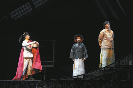 王雷、關(guān)棟天、張頁(yè)川分別飾演鄧世昌、丁汝昌、李鴻章(從左至右)。記者 方非 攝