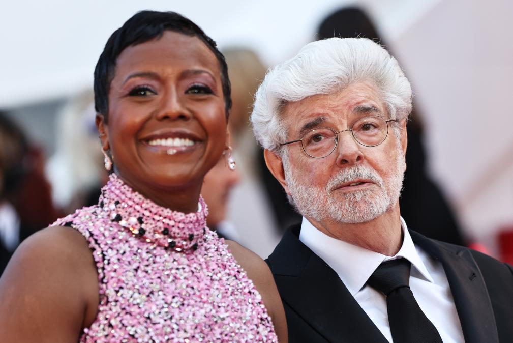 5月25日,在法國南部城市戛納舉行的第77屆戛納電影節(jié)上,美國導(dǎo)演、編劇、制片人喬治·盧卡斯(右)抵達(dá)閉幕式紅毯。新華社記者 高靜 攝