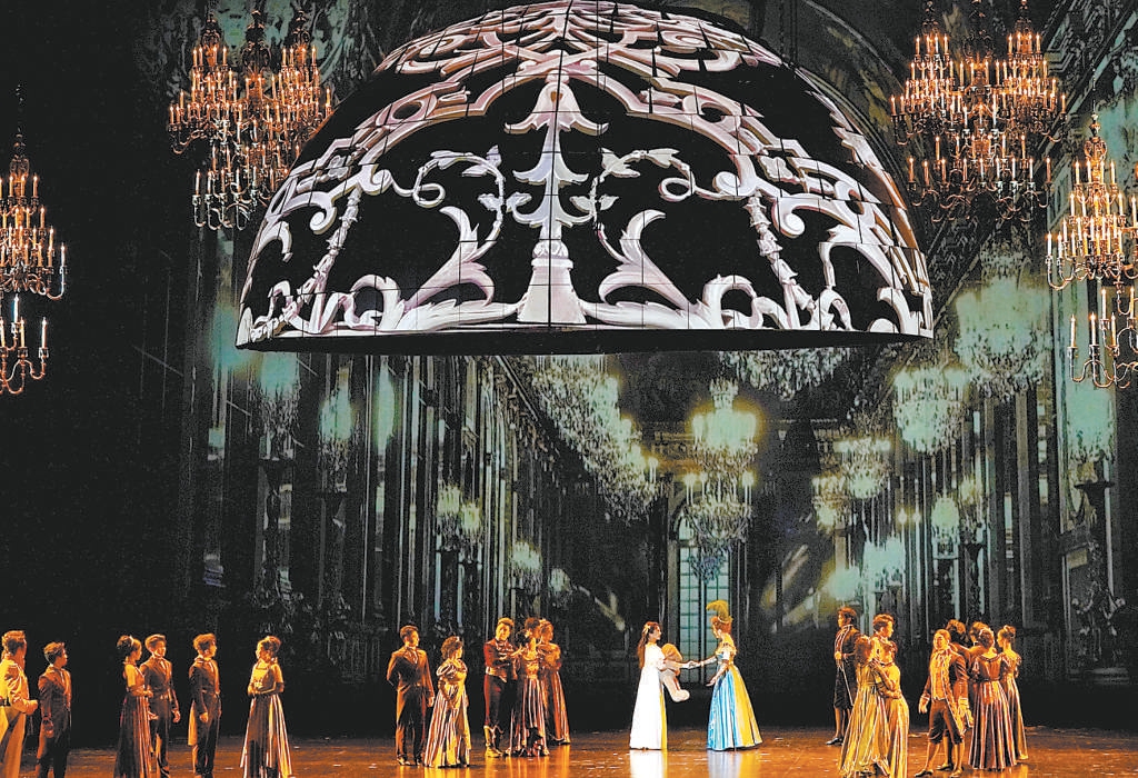 與壯闊宏大的作品立意相匹配的,是當(dāng)?shù)闷鹑A美二字的舞臺(tái)呈現(xiàn)。璀璨的吊燈、長(zhǎng)長(zhǎng)的樓梯等鮮明意象不斷出現(xiàn),簡(jiǎn)潔的布景與流動(dòng)的影像虛實(shí)交織,把輝煌的宮廷、幽靜的鄉(xiāng)村、無(wú)垠的星空等場(chǎng)景營(yíng)造得深邃動(dòng)人。其中,由多塊LED屏拼成的圓弧最引人注目,在舞美設(shè)計(jì)維亞切斯拉夫·奧庫(kù)涅夫的解讀中,和平的寧?kù)o短暫降臨時(shí),圓弧可以隨影像變幻為宮殿穹頂、簡(jiǎn)潔的花園涼亭,為生活遮風(fēng)擋雨;戰(zhàn)爭(zhēng)襲來(lái),刺目的紅光從破裂崩碎的圓弧中迸濺而出,恰如滿目瘡痍、生靈涂炭的現(xiàn)實(shí)。最終,幾瓣圓弧拼成碧水青山的“地球”,呼應(yīng)原著小說(shuō)標(biāo)題中的俄語(yǔ)單詞“Mip”,即“世界”,將作品的意境再次推上新的高點(diǎn)。