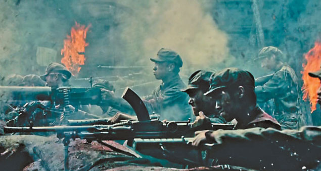 相比于以往表現(xiàn)毛澤東同志革命故事的作品,此次《浴血榮光》在如何表現(xiàn)建軍過程的影像上下了很大功夫。導(dǎo)演陳力做了精心設(shè)計(jì),她讓影像不僅還原歷史,還富有更為深刻的寓意。比如,毛澤東在湖南發(fā)動秋收起義前,前往萍鄉(xiāng)安源煤礦的兵工廠,和工農(nóng)兄弟一起鍛造鐮刀與斧頭等武器,他在畫面的黃金分割點(diǎn)慷慨演說,鋼鐵熔爐里火紅的光芒照射在他身上,充滿油畫般的力量感和造型感,也寓意著人民軍隊(duì)就誕生于工農(nóng)中。