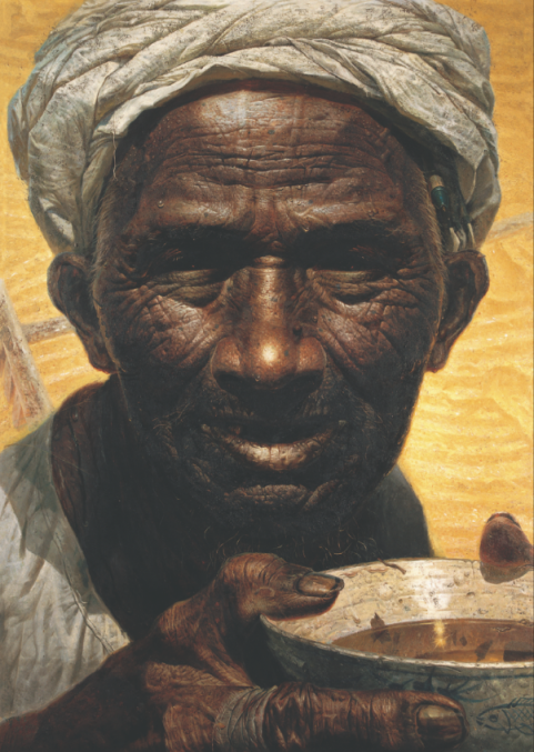 烈日下的一位老農(nóng),在勞動(dòng)的間隙手捧粗瓷碗準(zhǔn)備喝水,大顆晶瑩的汗水流過他臉上深深的溝壑。展覽展出的羅中立油畫《父親》以紀(jì)念碑式的宏偉構(gòu)圖、超寫實(shí)的手法,飽含深情地刻畫出中國(guó)農(nóng)民的典型形象。1980年,羅中立以《父親》震撼中國(guó)畫壇,并獲第二屆全國(guó)青年美展一等獎(jiǎng)。數(shù)十年來,這張臉龐深深打動(dòng)了無數(shù)中國(guó)人的心,成為改革開放以來中國(guó)現(xiàn)實(shí)主義藝術(shù)創(chuàng)作的一道豐碑。