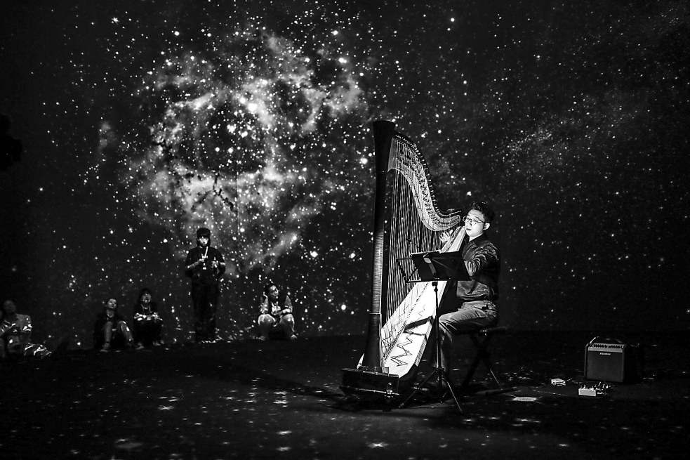 開(kāi)幕當(dāng)天還舉辦了以“奔赴天文與藝術(shù)的宇宙浪漫”為題的論壇,圍繞展覽中的天文藝術(shù)作品展開(kāi)討論。時(shí)代美術(shù)館執(zhí)行副館長(zhǎng)劉威威表示,展覽通過(guò)藝術(shù)化手段、人文關(guān)懷的角度呈現(xiàn)硬核科學(xué)知識(shí),讓公眾更好地認(rèn)知科學(xué),感受宇宙的浪漫。她相信,這樣“詩(shī)意的科普”與“科普的詩(shī)意”結(jié)合也許是未來(lái)科學(xué)藝術(shù)展的趨勢(shì)之一。論壇結(jié)束后,青年豎琴演奏家馬佳杰在星輝斑斕的展廳內(nèi)帶來(lái)了精彩的現(xiàn)場(chǎng)音樂(lè)會(huì)。展覽將持續(xù)至10月8日。