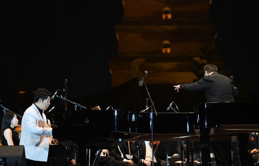9月10日晚,鋼琴家郎朗(左)、指揮家呂嘉(右)與西安交響樂團(tuán)在西安大雁塔北廣場戶外公演。新華社記者 李一博 攝