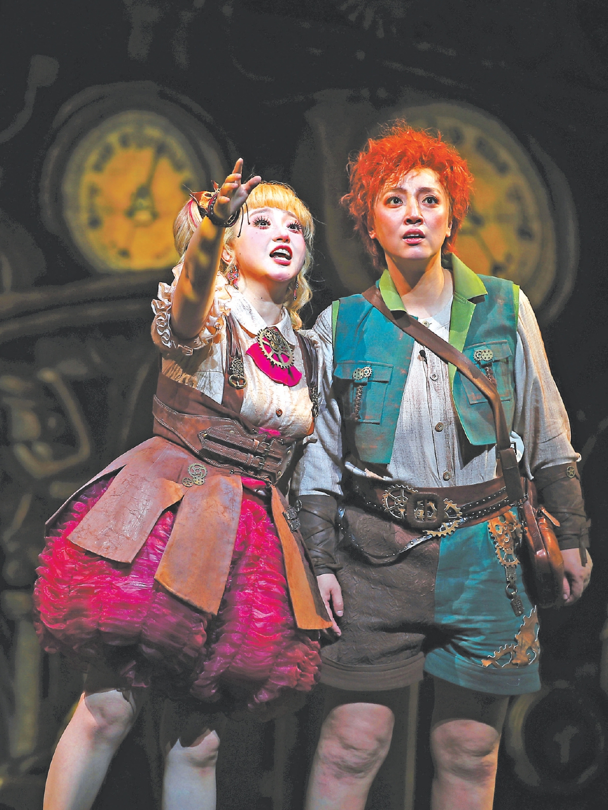 除了優(yōu)美的音樂和沉浸式的互動(dòng)設(shè)計(jì),該劇富有想象力的舞美還原了洪佩爾丁克筆下《漢塞爾與格蕾泰爾》溫馨、奇幻的絕妙特征?!霸谠O(shè)計(jì)時(shí),我試圖構(gòu)建一個(gè)全新的場(chǎng)景,創(chuàng)造一個(gè)新奇的蒸汽朋克世界?!蔽杳涝O(shè)計(jì)常煒表示。在主要場(chǎng)景中,大量使用蒸汽朋克風(fēng)格的機(jī)械元素,如齒輪、管道和機(jī)器零件作為舞臺(tái)布景的一部分,與《糖果屋》夢(mèng)幻元素相融合,造型上以扭曲變形的表現(xiàn)手法,營(yíng)造出奇幻而機(jī)械化的場(chǎng)景。古銅復(fù)古的色調(diào)加上少量鮮艷的色彩,為舞臺(tái)增添一種古老而神秘的氛圍,與夢(mèng)境這場(chǎng)戲的夢(mèng)幻元素形成有趣的對(duì)比。