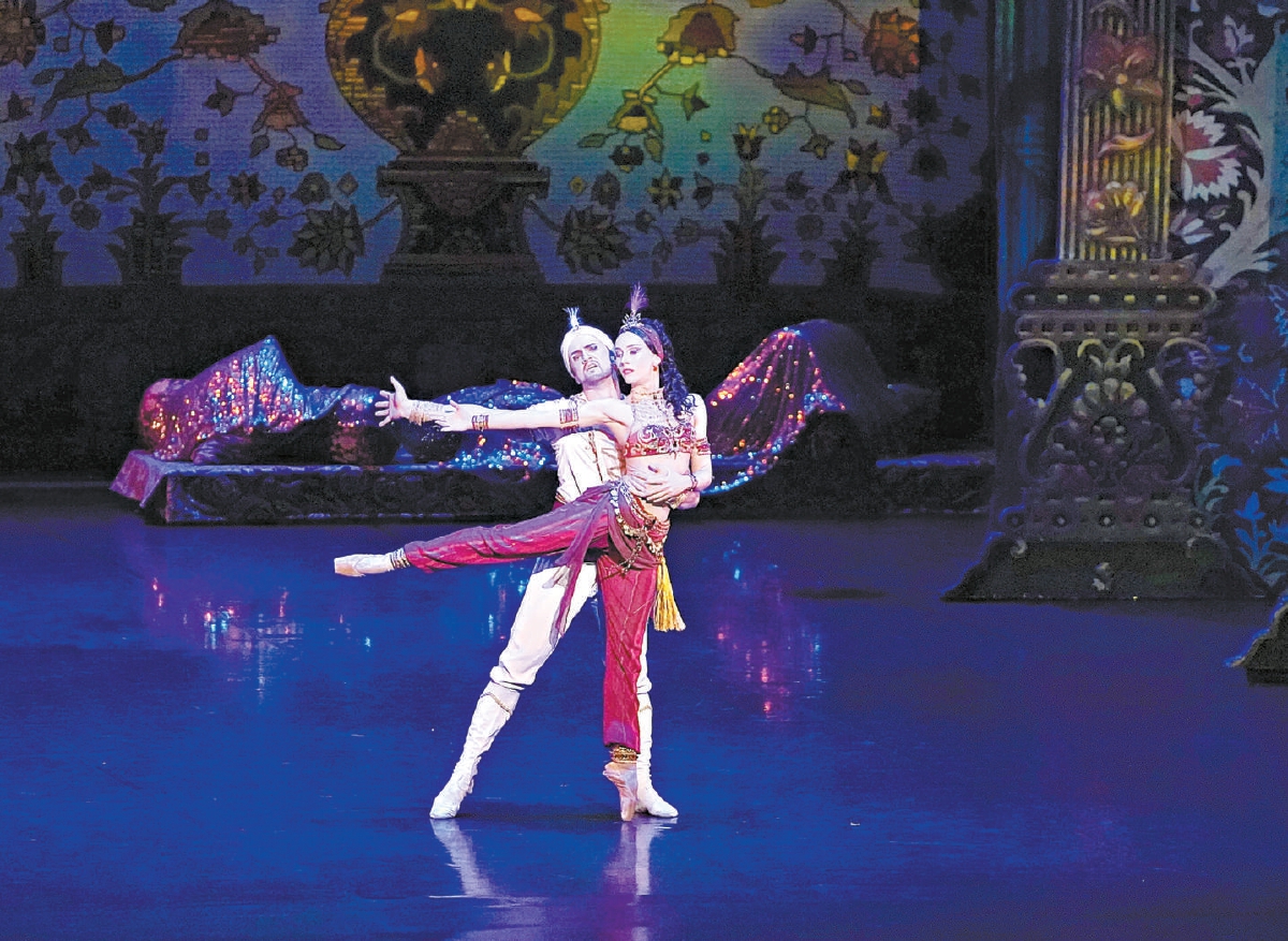 故事在富麗堂皇的宮殿中開啟,典雅繁復(fù)的梁柱、燦如繁星的燈盞幽邃美麗,夢(mèng)幻得令人驚嘆。連續(xù)3天,兩位首席舞者安娜·薩莫斯特列洛娃、伊琳娜·薩波日尼科娃與第一獨(dú)舞拉達(dá)·薩爾塔科娃各自領(lǐng)銜的3組演員陣容輪番上場(chǎng),舞動(dòng)著這部作品的波折壯麗。同時(shí),阿塞拜疆民族作曲家菲克列特·阿羅米夫?yàn)椤兑磺Я阋灰埂匪鞯呐錁纺腿藢の?,他將東方旋律與歐洲古典形式交織,大量運(yùn)用邦戈鼓、大鑼、木琴、顫音琴等打擊樂器,并加入了阿塞拜疆傳統(tǒng)弦樂器塔爾琴。在阿尤布·古利耶夫的帶領(lǐng)下,中央芭蕾舞團(tuán)交響樂團(tuán)的現(xiàn)場(chǎng)演奏極具戲劇張力和沖擊感,為整臺(tái)演出鋪陳了瑰麗磅礴的底色。