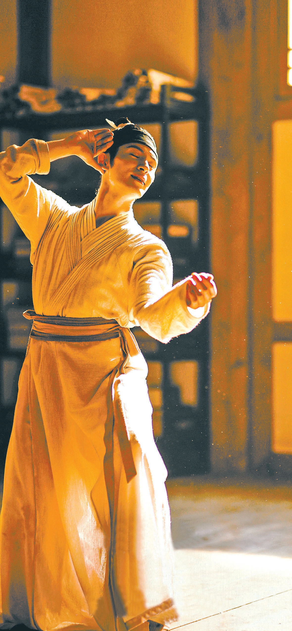 除此之外,《只此青綠》對(duì)舞蹈部分的呈現(xiàn)也十分精彩,用近景和特寫捕捉動(dòng)作細(xì)節(jié),用全景拍攝群舞的整體畫面。故事中情緒激昂的部分,如“問篆”“尋石”“淬墨”三篇,利用傾斜、旋轉(zhuǎn)等特殊景別和運(yùn)鏡來表達(dá)。寫意較多的部分,如“青綠”“入畫”兩篇,用特效輔助畫面,舞者的裙裾在地面上留下青綠墨痕,讓已在畫中靜待千年的色彩瞬間活了起來。此外,高速攝影進(jìn)一步保留了舞者的姿態(tài)和動(dòng)作細(xì)節(jié)。可以說,電影版《只此青綠》充分利用銀幕鏡頭的特性,幫助觀眾更好地欣賞、理解舞蹈,也讓整個(gè)故事有了更強(qiáng)的沉浸感。