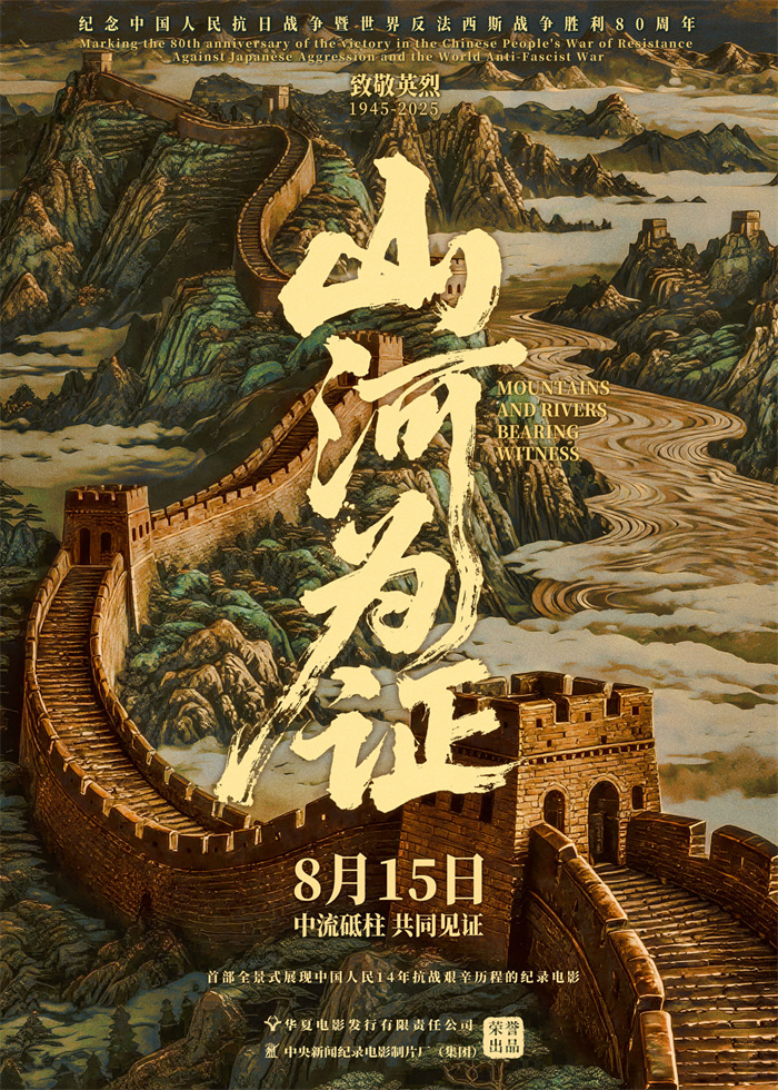 在紀(jì)念中國人民抗日戰(zhàn)爭暨世界反法西斯戰(zhàn)爭勝利80周年的重要?dú)v史時(shí)刻,紀(jì)錄電影《山河為證》正式宣布定檔,將于2025年8月15日登陸全國院線。影片由華夏電影發(fā)行有限責(zé)任公司與中央新聞紀(jì)錄電影制片廠(集團(tuán))出品,同步發(fā)布定檔版海報(bào)。