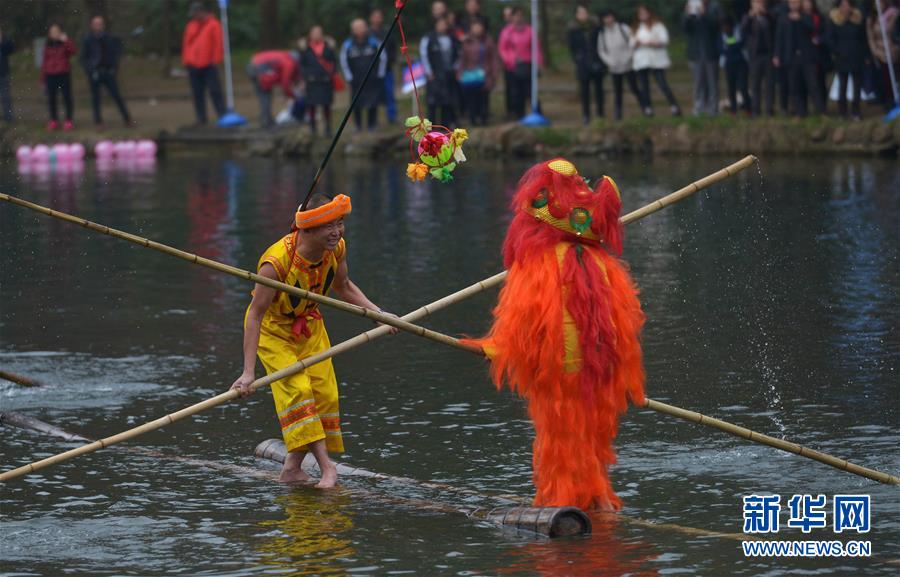 1月1日,“獨竹漂”愛好者在花溪河上表演水上高難度平衡動作。 2016年元旦,在貴陽市花溪公園平橋河段舉行的貴陽市第31屆冬泳表演活動中,數(shù)十名“獨竹漂”愛好者在花溪河上腳踏漂浮的竹竿,表演“金雞獨立”、轉(zhuǎn)身平衡等高難度動作,讓觀眾大飽眼福。新華社發(fā)(秦剛 攝)