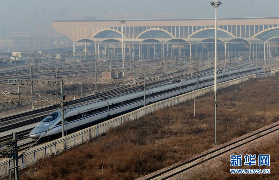 一輛動車組列車駛離石家莊火車站(1月9日攝)。 1月10日零時起,全國鐵路實行新的列車運行圖,增開旅客列車285.5對,其中增開動車組列車281.5對。運行圖調(diào)整后,全國鐵路開行旅客列車總數(shù)達(dá)到3142對,其中動車組列車1980.5對。新華社記者 牟宇 攝