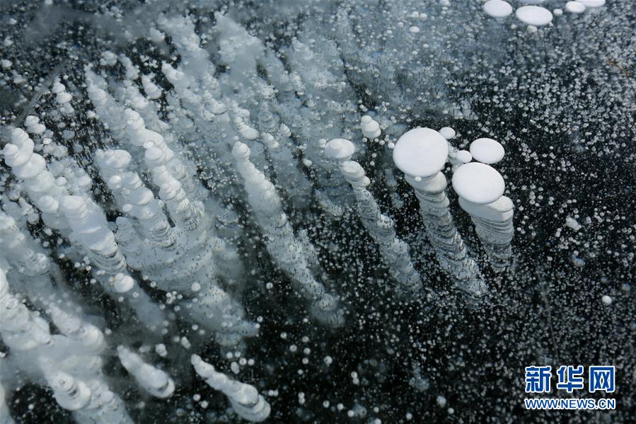 2月20日在新疆博爾塔拉蒙古自治州境內(nèi)的賽里木湖拍攝的湖面結(jié)冰后形成的冰花奇觀。進入2月份后,新疆海拔最高的湖泊賽里木湖湖面全部結(jié)冰,在湖邊的一些小泉眼處,不停泛出的氣泡在冷空氣作用下,迅速凝結(jié),形成了如冰柱、螺旋紋等形式多樣的冰花奇觀,令人嘆為觀止。新華社發(fā)(沈志君 攝)