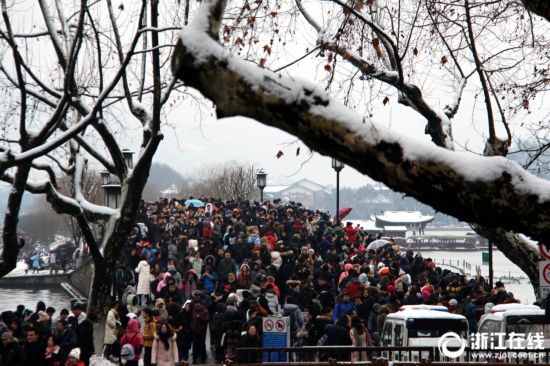 杭州:雨雪天氣收尾 斷橋火爆依舊