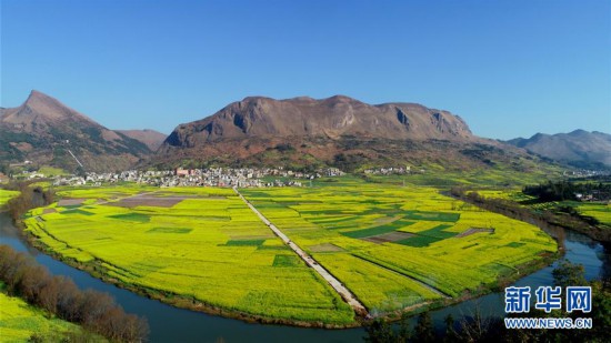 這是2月10日在云南省羅平縣拍攝的油菜花田(無人機(jī)拍攝)。 初春時節(jié),云南曲靖市羅平縣的油菜花盛開,黃花、碧水、群山、村舍相映成趣,透出濃濃春意。 新華社發(fā)(毛虹 攝)