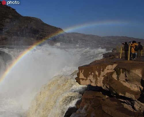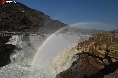 2019年11月25日,山西吉縣黃河壺口瀑布出現(xiàn)“彩虹通天”美景。入冬以來(lái),隨著黃河干流水位回落,壺口瀑布落差加大,滾滾河水翻滾而下,飛濺起30多米高的水霧,在陽(yáng)光的照射下,形成“彩虹通天”的美麗景象,讓游客流連忘返。呂桂明/攝