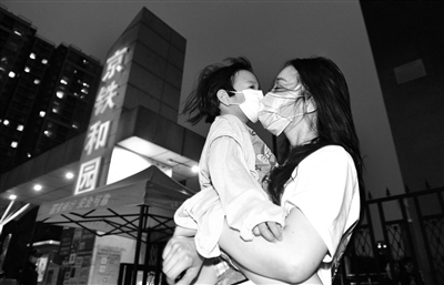 昨晚8點剛過,京鐵和園小區(qū)已有居民走出小區(qū),前往附近的超市、公園。在小區(qū)門口,3歲的多多老遠就看到門外的媽媽,高興壞了。多多的媽媽告訴北青報記者,孩子一直住在京鐵和園的奶奶家,社區(qū)封閉后,她只能晚上隔著大門看看孩子。聽說昨晚社區(qū)解除封閉,她特意趕過來想抱一抱多多。不過,由于多多和奶奶的出入證正在辦理中,孩子還不能走出小區(qū)。在征得門口值守人員的同意后,多多跟媽媽終于在小區(qū)外重逢,母子倆擁抱在一起。