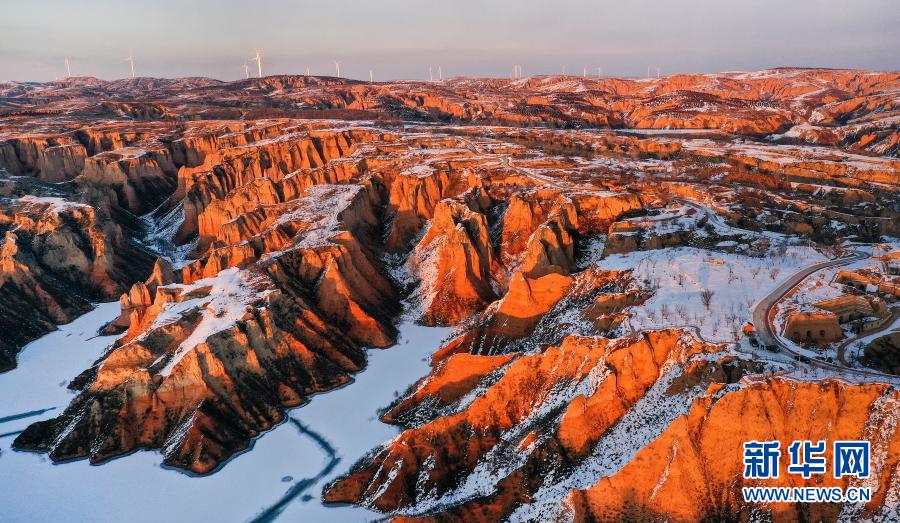 12月3日拍攝的雪后初霽的陜西省榆林市麻黃梁黃土地質(zhì)公園(無人機照片)。