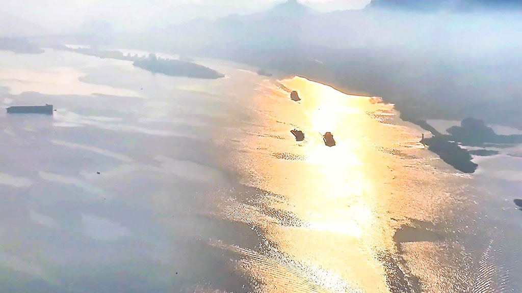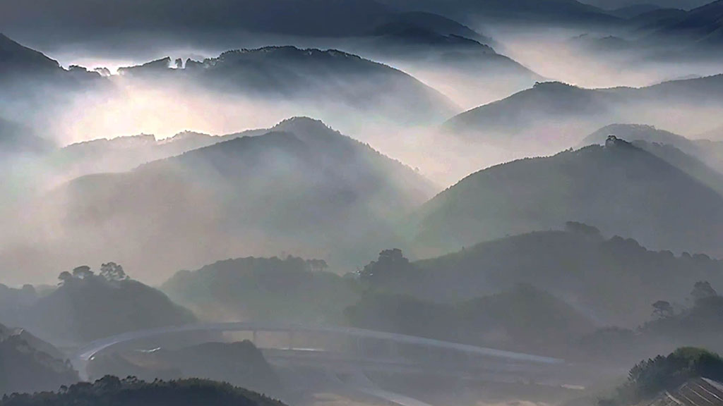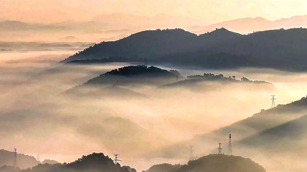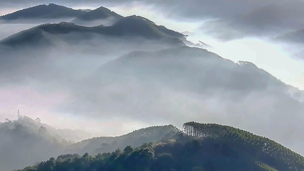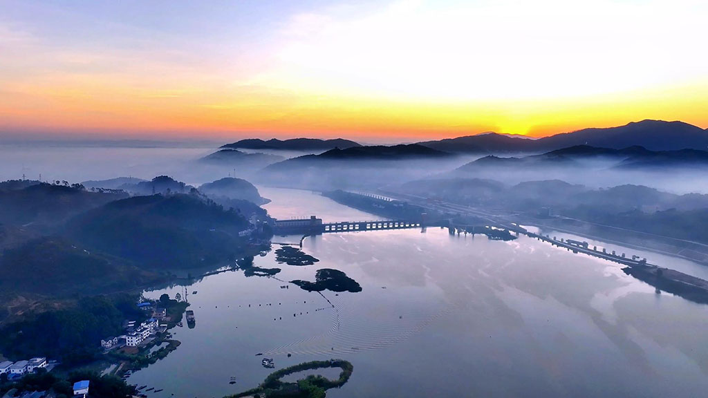 連綿的山巒、氤氳的湖泊,散居的村落、蔥郁的林木,在薄霧籠罩下,西津湖宛如一幅流動的水墨畫。