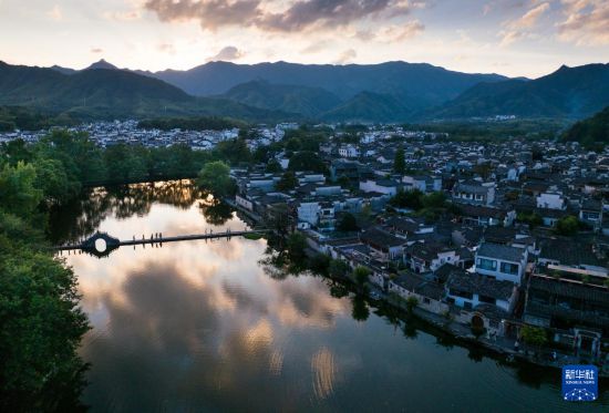 夏日傍晚時(shí)分,在擁有900多年歷史的中國傳統(tǒng)古村落、位于安徽省黃山市黟縣的宏村,湖面倒映著晚霞,游人在橋間駐足流連,享受季夏夜晚時(shí)光。