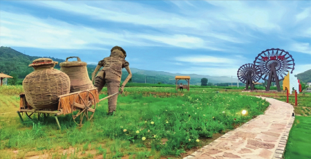游走村內(nèi),瀟河源文化主題公園里有不少新穎物件:風(fēng)動(dòng)的鐵藝風(fēng)車,像向日葵一般對(duì)著太陽(yáng)開(kāi)合;可以鍛煉用的水槍,需要用力向下壓幾下才能噴出很遠(yuǎn)的水,用來(lái)澆灌花叢;還有會(huì)唱歌的“石頭”、用木條編制成的敲鑼大兔子……村內(nèi)樹(shù)木叢生,百草豐茂,綠葉水光交織,讓人心曠神怡,流連忘返。