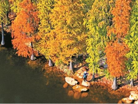 隨著天氣轉(zhuǎn)冷,廣西南寧市多個(gè)公園的杉樹樹葉愈發(fā)紅艷,分外靚麗。圖為12月21日,市民在廣西南寧市青秀山風(fēng)景區(qū)的杉樹林里游玩。 新華社記者 周華攝
