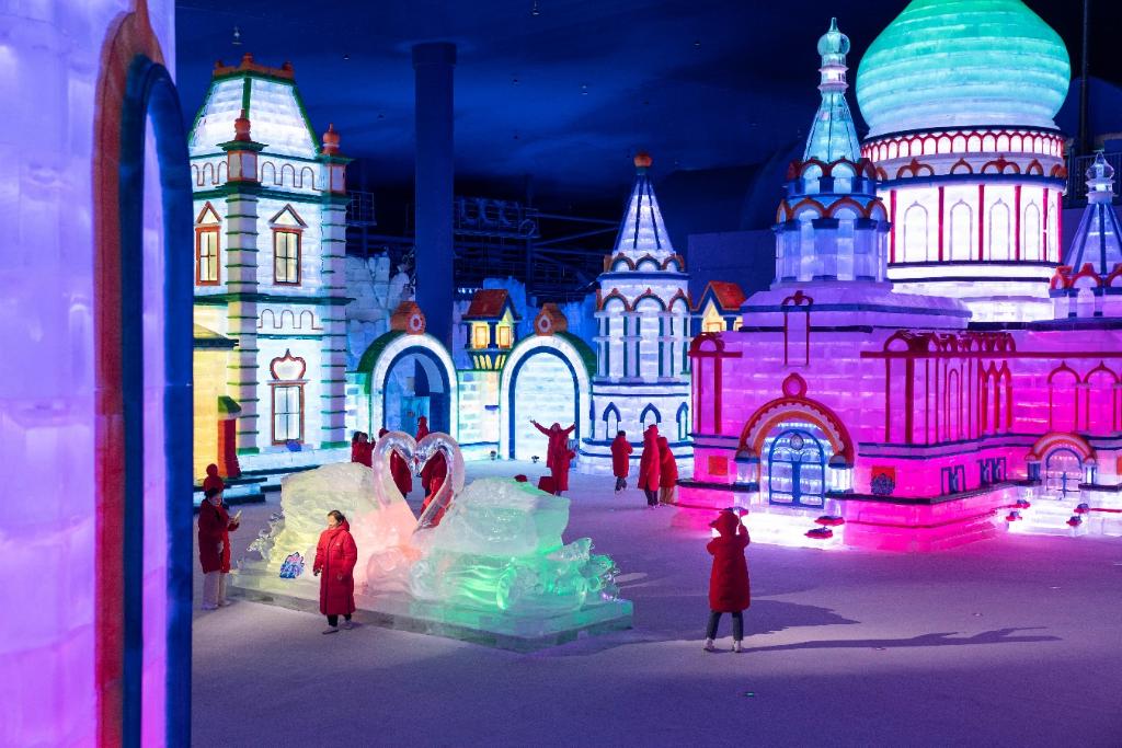 夢(mèng)幻冰雪館吸引游客“打卡”。新華社發(fā) 今夏,哈爾濱冰雪大世界將以5大核心產(chǎn)品和10大亮點(diǎn)項(xiàng)目,推出“啤酒+冰雪+演出+科技+活動(dòng)”融合新業(yè)態(tài),持續(xù)優(yōu)化文旅消費(fèi)新場(chǎng)景,為“冰城”夏季旅游打造新的“流量密碼”。