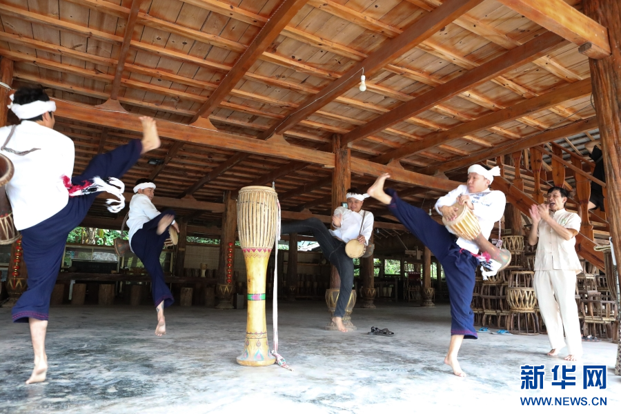 8月16日,波罕丙(右一)帶領(lǐng)徒弟練習(xí)象腳鼓舞。新華網(wǎng)發(fā)(李云生 攝)