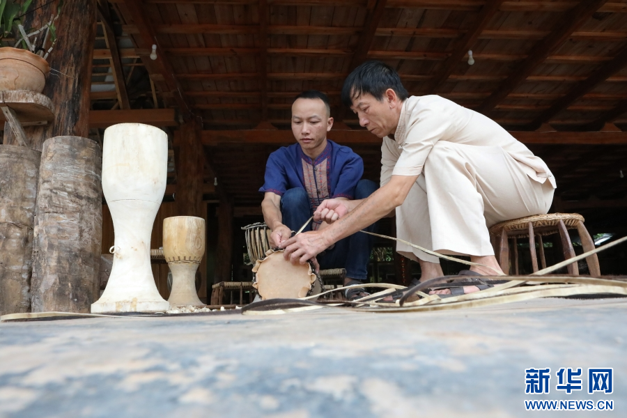 8月16日,波罕丙(右)與兒子巖罕丙一同制作象腳鼓。新華網(wǎng)發(fā)(李云生 攝)