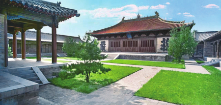 永安寺,原稱渾源州永安禪寺及神州大永安禪寺,俗稱“大寺”,始建于金,金元之交被火毀后重建,明、清以來均曾在當(dāng)?shù)毓賳T倡導(dǎo)下續(xù)建與增修。該寺位于渾源古城東北隅,坐西北朝東南,本為以中軸線為主,東西軸各輔以跨院或偏院的五進(jìn)場(chǎng)院空間大型寺廟建筑群,現(xiàn)僅存前院及東西跨院和中院主體建筑群,東西寬52米,南北深78米,占地面積4056平方米。寺內(nèi)現(xiàn)存文物建筑物7座、清代壁畫305.4平方米、建筑彩畫2118平方米,古代碑碣2方,石獅一對(duì)。主殿傳法正宗殿為元延祐二年(1315年)原構(gòu),是我國建筑史上廡殿頂建筑的杰作,殿內(nèi)滿堂水陸畫、建筑彩畫及殿頂五彩琉璃均保存完好且異常精美,聞名遐邇。