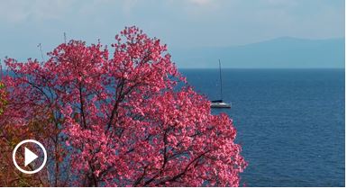 近日,云南玉溪澄江的撫仙湖畔,冬櫻花如期盛放,裝點(diǎn)湖光山色。(玉溪市融媒體中心記者 李江報(bào)道)