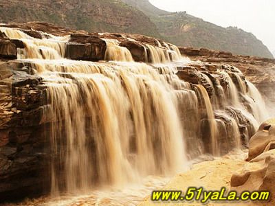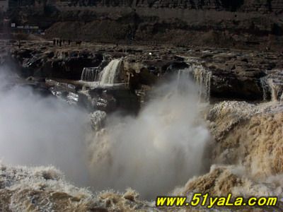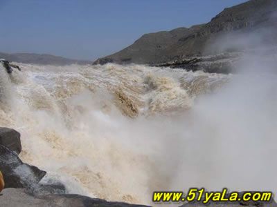 壺口瀑布位于吉縣城西45公里、距臨汾市165公里處的晉陜峽谷黃河河床中,為世界上最大的黃色瀑布,因其氣勢雄渾而享譽(yù)中外。此地兩岸夾山,河底石巖上沖刷成一巨溝,寬達(dá)30米,深約50米,滾滾黃水奔流至此,倒懸傾注,若奔馬直入河溝,波浪翻滾,驚濤怒吼,震聲數(shù)里可聞。其形如巨壺沸騰,故名。黃河浪濤激起一團(tuán)團(tuán)霧煙云隨著水霧的升高,煙云由黃變灰、由灰變藍(lán),景色奇麗,有“水底生煙”之說。壺口瀑布不僅有“水底冒煙”,“彩橋通天”奇景,更有“旱地行船”之說。上游船只到此,必須離水登陸,經(jīng)人抬或車運繞過壺口(即所謂“旱地行船”)方可入水續(xù)航,千百年來,概莫能變。