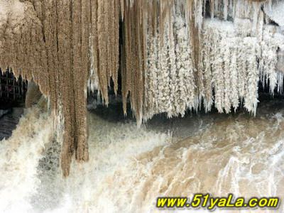 由于四季氣候和水量的差異,壺口景色也時有所變。壺口的春秋兩季,景象也甚為奇特,有氣為虹,橫浮水上,形成了“岸旁無虹掛長雨”的景觀。春回大地的時候,漫山遍野的山桃花盛開,黃河冰岸消融,水量適度平穩(wěn),主瀑、副瀑連成一片,看主瀑云霧迷蒙,望副瀑萬壑千流,觀“龍槽”如巨龍掀浪,稱為“三月桃花汛”;秋季9-11月份雨季剛過去時,河邊眾多山泉小溪,匯集大量清流,陣陣秋風(fēng)吹過,常有彩虹出現(xiàn),叫做“壺口秋風(fēng)”。明陳維藩《壺口秋風(fēng)》詩有“秋風(fēng)卷起千層浪,晚日迎來萬丈紅”句,可謂真實寫照。這兩個時期,水大而穩(wěn),瀑布寬度可達(dá)千米左右。主瀑難以接近,但遠(yuǎn)遠(yuǎn)望去,煙波浩淼,威武雄壯。大浪卷著水泡,奔騰咆哮,以翻江倒海之勢,飛流而下。壺口的冬日,又是一種奇觀:壺口兩側(cè),冰簾垂掛,晶瑩剔透,格外誘人,農(nóng)歷小雪,大雪前后,上游漂流下來的大冰塊,落入壺口平緩處,冰塊相交,冰峰凍結(jié),冰橋天然合成,人履冰橋,如走坦途,人們稱為“壺口叉橋”。在天橋村附近,積冰成橋,冰橋下激流滾滾,濤聲大作,人們稱之為“天橋”。