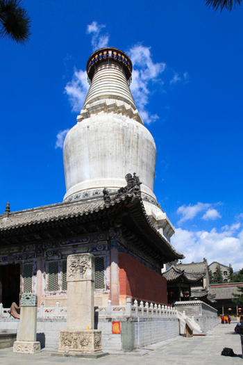塔全稱(chēng)為釋迦牟尼舍利塔,俗稱(chēng)大白塔。塔身?yè)艿囟鹆杩崭呗枺谖迮_(tái)山群寺簇?fù)碇骂H為壯觀,人們把它做為五臺(tái)山的標(biāo)志。此塔通高七十五點(diǎn)三米,環(huán)周八十三點(diǎn)三米。塔基為正方形,塔身狀如藻瓶,粗細(xì)相間,方圓搭配,造型優(yōu)美。塔頂蓋銅板八塊成圓形,按乾、坎、艮、震、巽、離、坤、兌等八卦地位安置。塔頂中裝銅頂一枚,高約五米,覆盤(pán)二十一米多,飾有垂檐三十六塊,長(zhǎng)兩米多;每塊垂檐底端掛風(fēng)鐘三個(gè),連同塔腰風(fēng)鐘在內(nèi),全塔共有二百五十二個(gè)。風(fēng)歡鈴動(dòng),叮鐺作響。