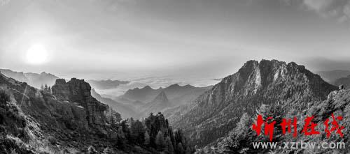 站在峰巔,舉目眺望,但見在初升的陽光照耀下,經(jīng)過大雨洗滌的綠色山峰,呈現(xiàn)出一種奇異的火紅色彩,別有一番神韻。環(huán)顧四周,峰巒重疊,溝壑縱橫,石猴山、臥虎山等30多座海拔2000多米以上的兄弟峰巒,簇?fù)碇盖偷奶J芽諸山,其勢綿延不絕,氣象磅礴壯觀。云霧在山峰飄蕩,如煙似雨,彌漫四合。尖峭高聳、怪石嶙峋的蘆芽諸山,突出于翻伏騰涌的云霧之上,仿佛蔥蘢茁壯的蘆芽破石而出,生機勃勃,鮮嫩欲滴,翠色宜人。