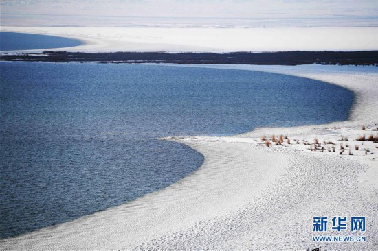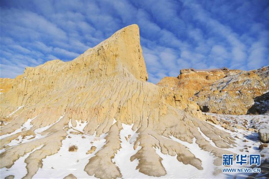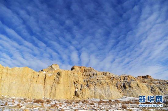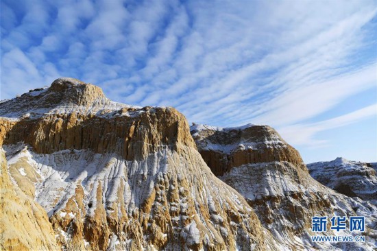 11月26日拍攝的新疆福??h烏倫古湖海上魔鬼城景區(qū)美景。 福??h烏倫古湖海上魔鬼城景區(qū)位于新疆阿勒泰地區(qū)福??h吉力湖東岸,有著獨(dú)特的雅丹地貌和水域景觀,是當(dāng)?shù)刂穆糜蝿俚亍?新華社記者 沙達(dá)提 攝