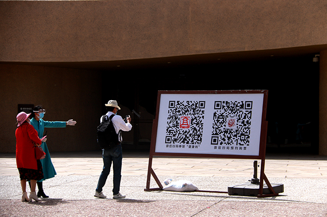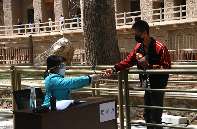 10日上午9點(diǎn),在敦煌莫高窟數(shù)字展示中心門票業(yè)務(wù)辦理處,幾十名游客正在“1.5米線”排隊(duì)等候測(cè)溫登記,在通向窟區(qū)的擺渡車上,游客按照間隔就座。游客申領(lǐng)國(guó)家或者甘肅省的“健康碼”后,可預(yù)約購(gòu)買10日內(nèi)的門票。