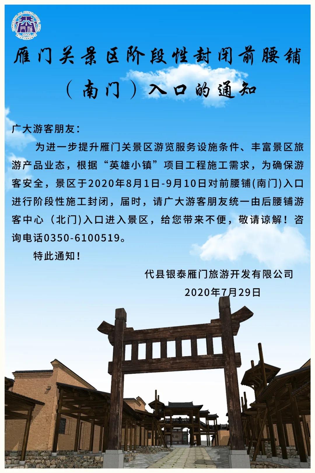 為進(jìn)一步提升雁門關(guān)景區(qū)游覽服務(wù)設(shè)施條件、豐富景區(qū)旅游產(chǎn)品業(yè)態(tài),根據(jù)“英雄小鎮(zhèn)”項(xiàng)目工程施工需求,為確保游客安全,景區(qū)于2020年8月1日-9月10日對(duì)前腰鋪(南門)入口進(jìn)行階段性施工封閉,屆時(shí),請(qǐng)廣大游客朋友統(tǒng)一由后腰鋪游客中心(北門)入口進(jìn)入景區(qū),給您帶來不便,敬請(qǐng)諒解!咨詢電話0350-6100519。