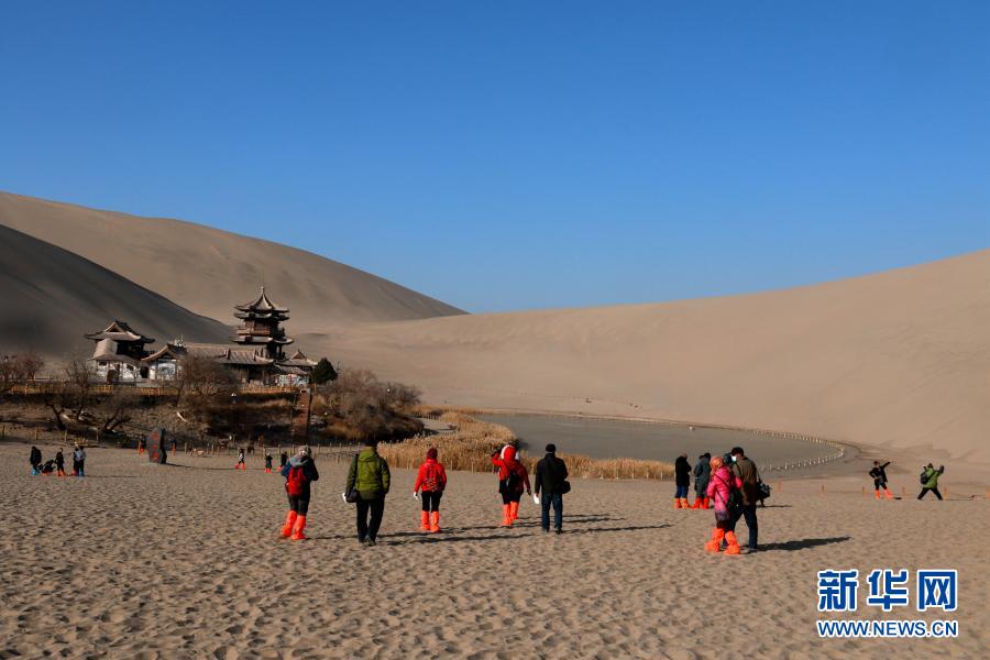 12月1日,游客在甘肅省敦煌市鳴沙山月牙泉景區(qū)游覽。 從當日起至2021年3月31日,敦煌市推出部分景區(qū)門票半價、賓館房費“五折”等多項冬春游優(yōu)惠措施,吸引游客。新華社發(fā)(張曉亮 攝)