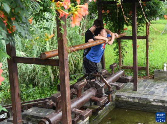 7月11日,游人在穆溝古村體驗踩水車。 位于江蘇阜寧的穆溝古村是座具有600多年歷史的自然村落,村域面積4000畝左右,村莊古樸風(fēng)貌保存較好。2020年底,當(dāng)?shù)貨Q定按照“修舊如舊”的原則對穆溝古村實施改造,既讓農(nóng)民的居住條件得到改善,又使古村整體形象得到升級;同時,古村引入多種傳統(tǒng)業(yè)態(tài)和現(xiàn)代文創(chuàng)產(chǎn)品,吸引眾多游客前來游玩體驗。 新華社記者 季春鵬 攝