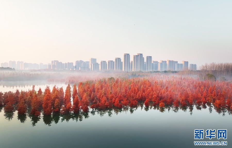 近日,在安徽省合肥市董鋪水庫,大片紅杉林迎來最佳觀賞期。從空中俯瞰,紅色的樹影倒映在綠水之上,讓人陶醉。新華網(wǎng)發(fā)(江河 攝)