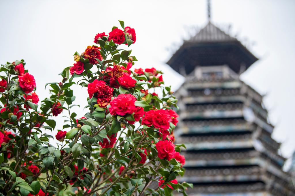 ?? 2024年3月10日,貴州省從江縣高增鄉(xiāng)占里侗寨內(nèi)盛開(kāi)的茶花與鼓樓相映成景。CICPHOTO/吳德軍 攝