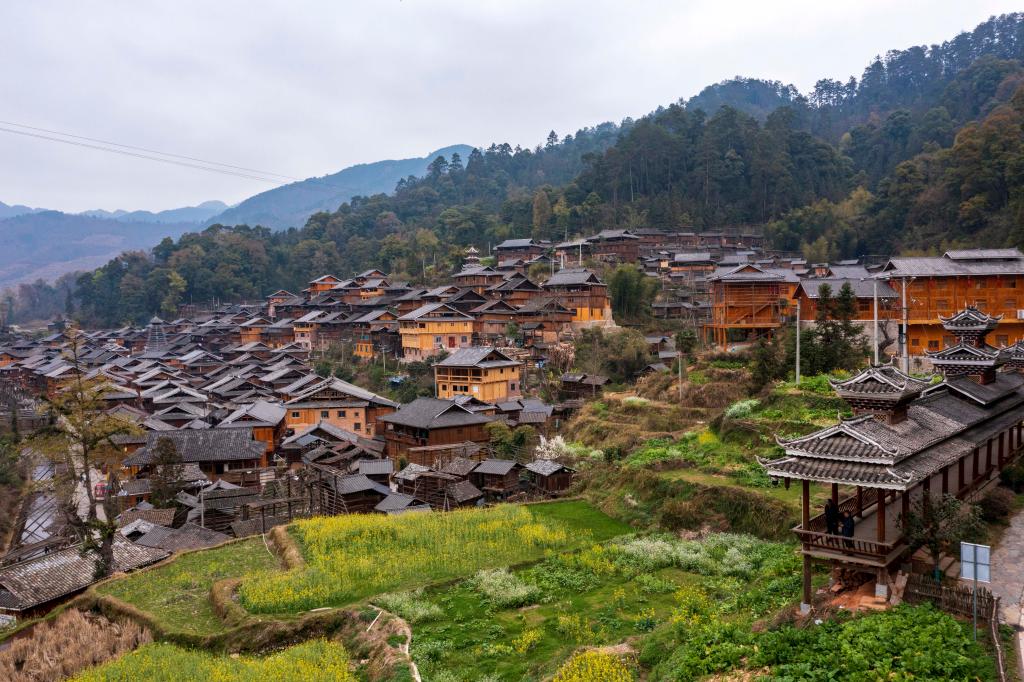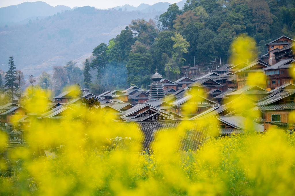 ?? 2024年3月10日,貴州省從江縣高增鄉(xiāng)占里侗寨內(nèi)盛開(kāi)的油菜花與鼓樓、民居相映成景。CICPHOTO/吳德軍 攝