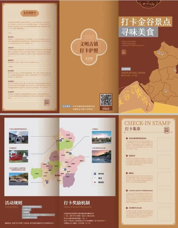 據(jù)安溪縣金谷鎮(zhèn)人民政府副鎮(zhèn)長張錦川介紹,為了吸引更多游客,金谷鎮(zhèn)黨委、政府推出一項“打卡金谷景點尋味美食”活動,在安南永德蘇維埃政府舊址、莫耶故居、威鎮(zhèn)廟、中共安溪中心縣委軍政干部訓(xùn)練班舊址紀(jì)念館、金谷溪岸藝術(shù)公園等5個景點設(shè)置蓋章點,游客任選其中4個景點完成打卡,即可領(lǐng)取一份“四物番鴨湯”。通過打卡的形式,鼓勵在不同景區(qū)完成打卡任務(wù),增加游客的參與度和體驗度。