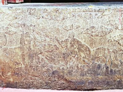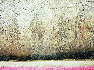 這是在澤州縣金村鎮(zhèn)顯慶寺毗盧殿殿門長約3米的地伏上雕刻的“西游記”故事浮雕,端詳四幅浮雕,觀者有翻看連環(huán)畫之感!