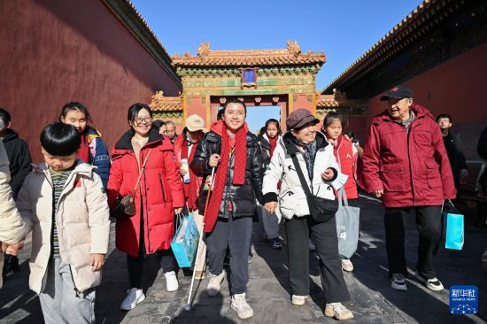 12月1日,北京市盲人學(xué)校學(xué)生在親屬和志愿者的陪同下游覽故宮。